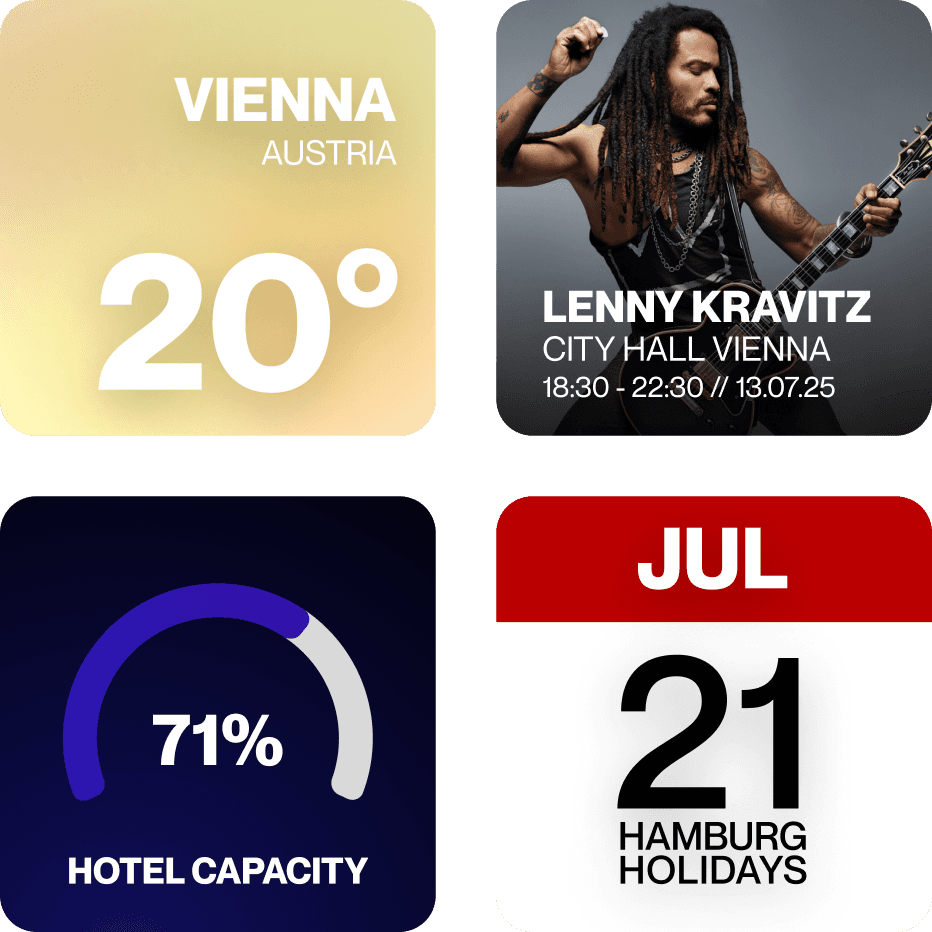 From weather to tourism and local events. Nightscale AI connects external signals to your daily operations, so you always stay one step ahead.